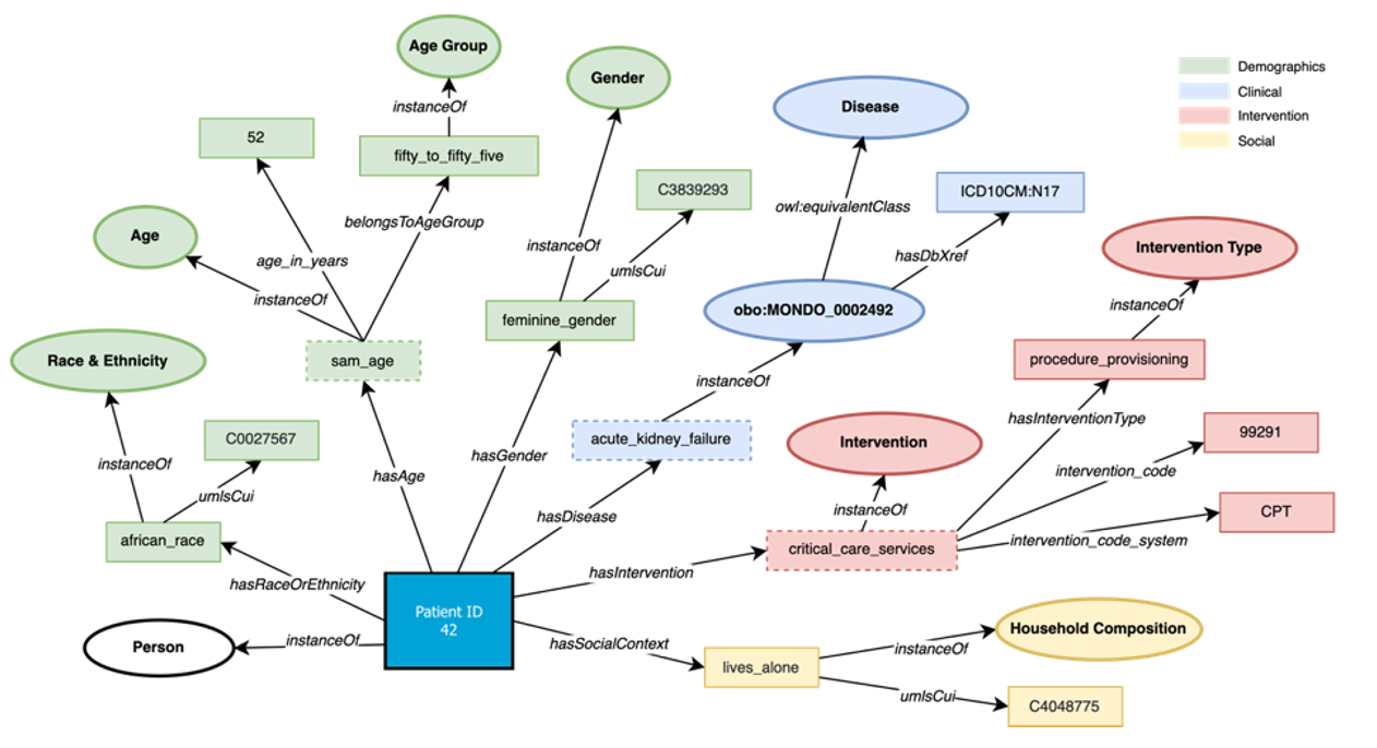 An entity-centric graph stems from RDF technology, and handles intricate domains that lack standardization. Relationships and associated information branches out from one or more central nodes. See the example below of a specific patient:
